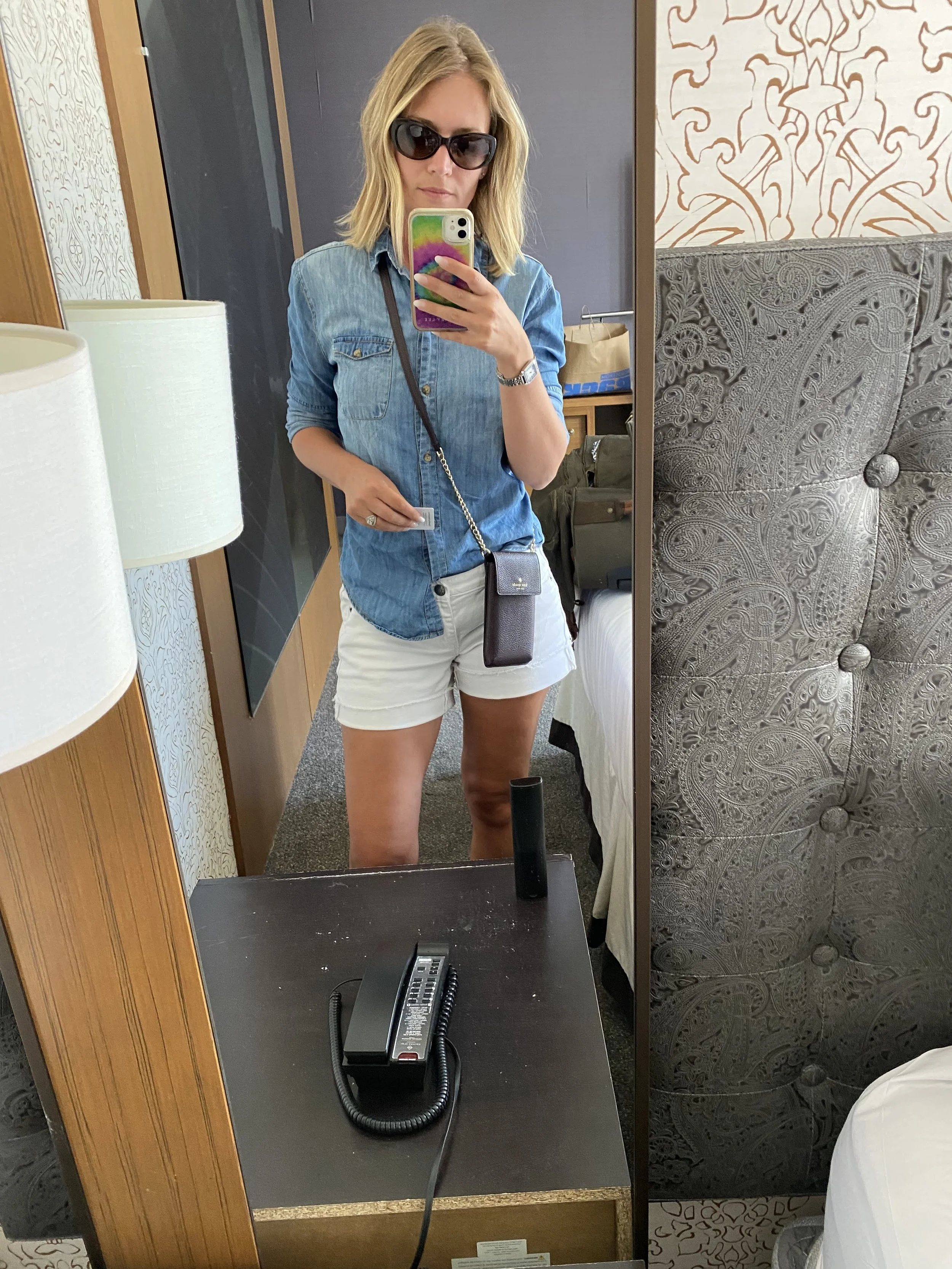 Chambray button down // J Crew White Denim Shorts // Kate Spade Phone Purse // Coach Sunnies