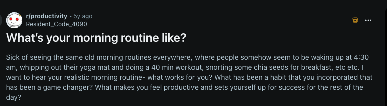 This morning, I landed on a 5 year old reddit page asking folks to report out on their morning routine -