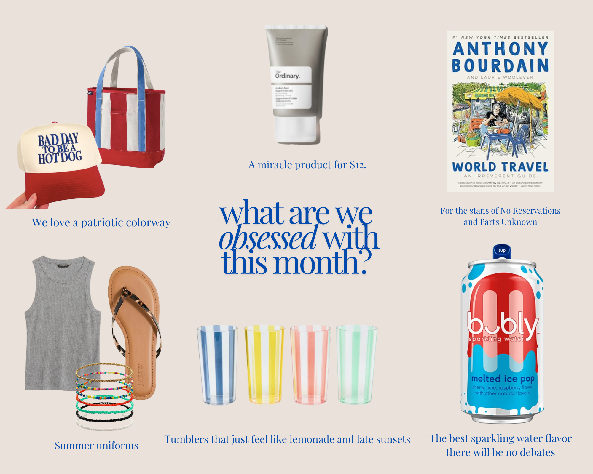 Bestsellers // Wow! What a mixed bag this month. Apparently I don’t have to persuade you to give the glow sticks a try because you guys are already on board. Also not surprised to see Azelaic Acid on the best seller list because I have been preaching away about the miracle power. Memorial Day, or maybe impending 4th of July, has us feeling the patriotic color way on this highly efficient tote bag. Same goes for this trucker hat - perfect for basically any day all summer long. And the most fun, these striped tumblers that are a big time bargain over at Target went home with lots of you (and me!). We got summer on the mind folks!
