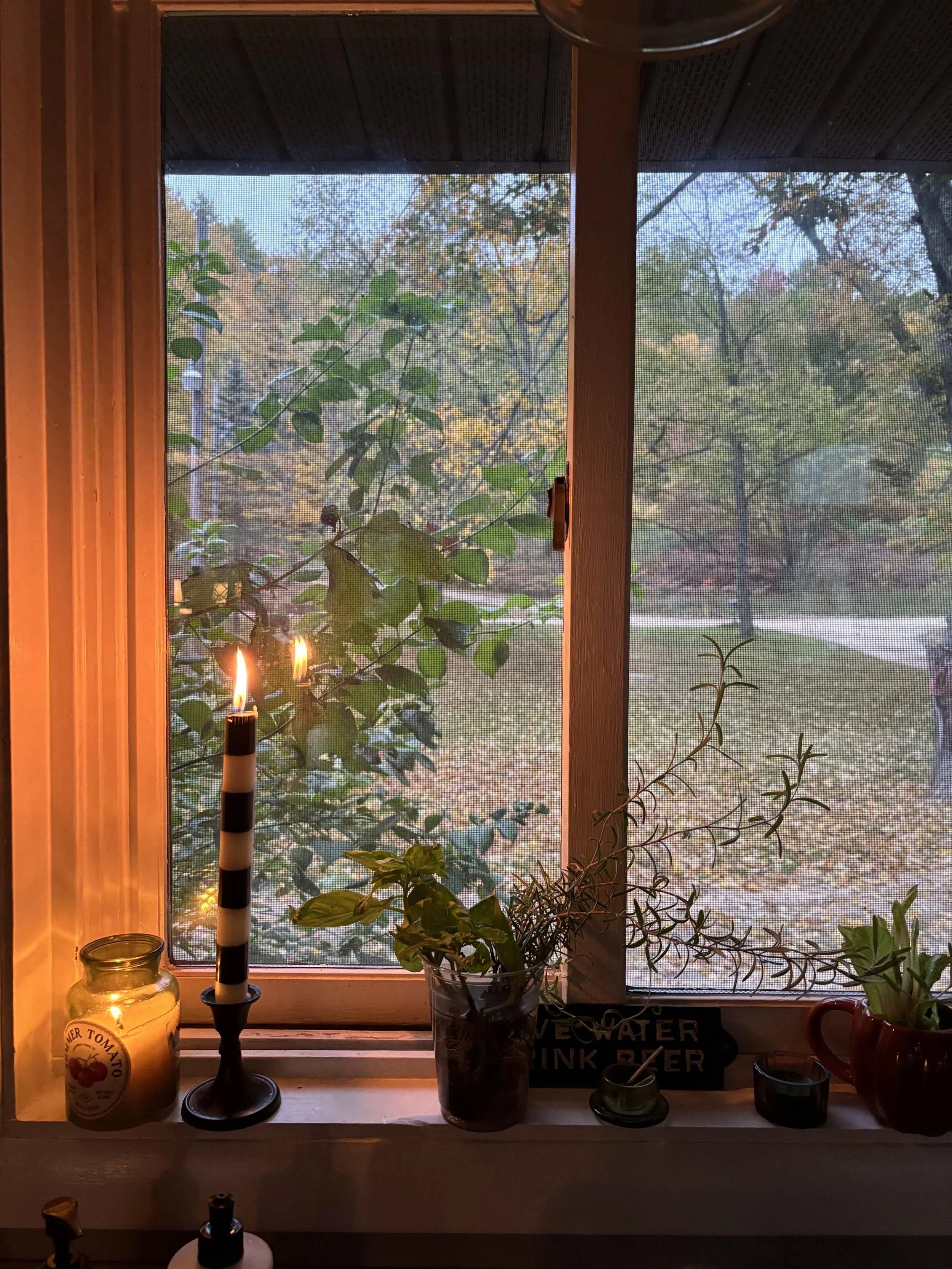 Anyway, October proved to be lovely transition month. We had several sunny days, the last of shorts and t-shirt weather, and those elusive scenes that only occur in October: blue skies against fiery red and orange leaves. It gradually got colder and I welcomed the rainy, gloomy afternoons that feel so vibey. Soup on the stove, hot tea in the afternoon. Hocus Pocus and Charlie Brown. I lit taper candles in the evening and bought a fresh pack of lightbulbs with a warm cast, maximum 60watts. The last day, Halloween, I spent with my sister and her family. Our kids stayed up into the morning hours trading candy and watching “scary” movies in the basement. It felt like a 90’s childhood experience and I was so glad my kids are building the same core memories I did.