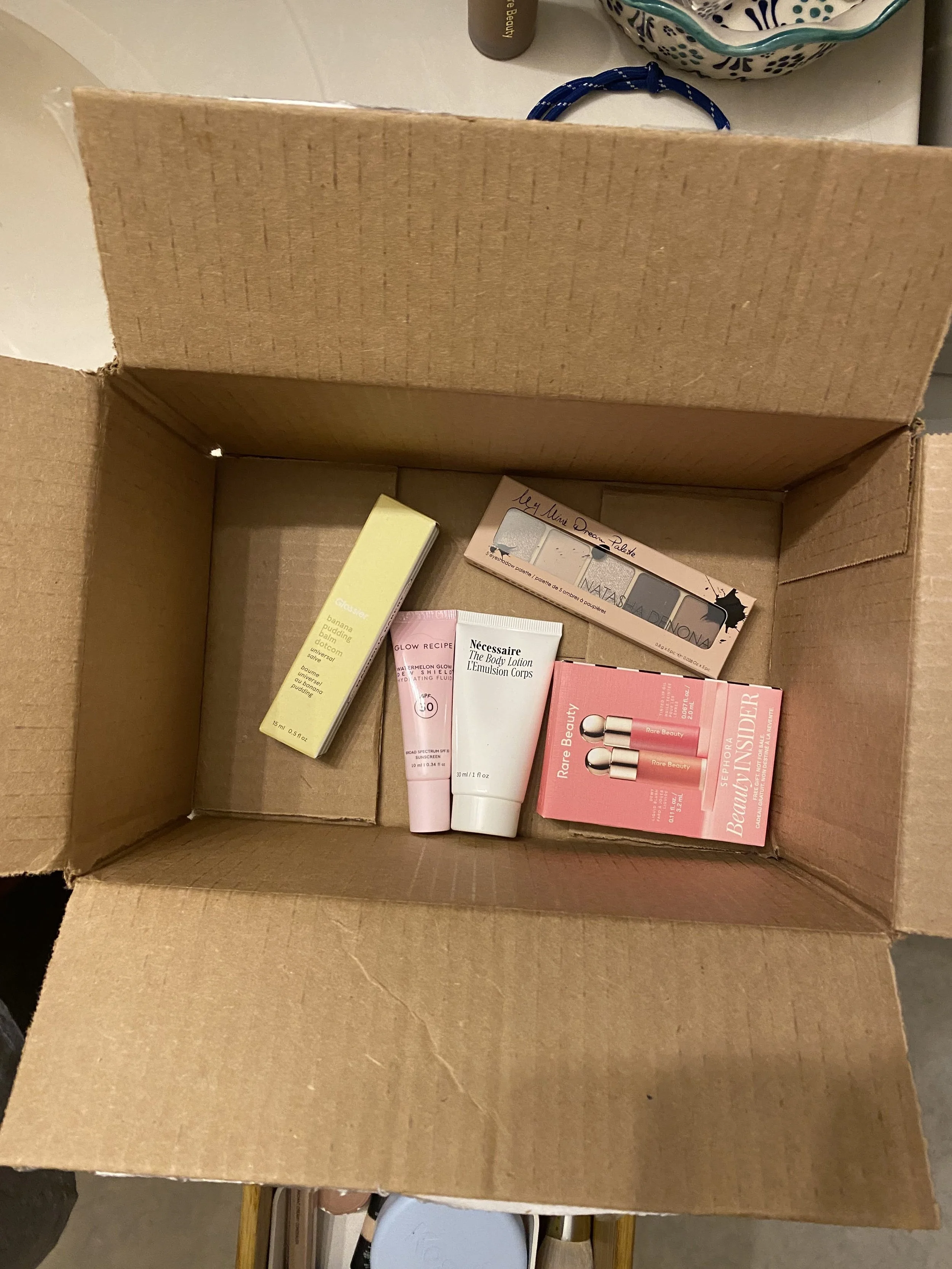 +If you’re a Sephora VIB member (do it, it’s free!), don’t forget to collect your birthday gift. I picked the Rare Beauty lip oil and soft pinch blush and it’s really good. Furthermore, I get myself my own birthday gifts (look, my marriage is happier this way) and I picked out this banana pudding balm that is a hit for anyone who loves banana laffy-taffy, and this mini eyeshadow pallet. It all arrived on Thursday and I love delayed gratification, so I forced myself to wait until my birthday to open the box.